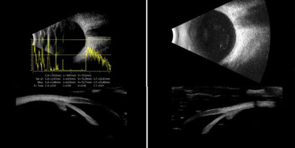 - Biomicroscopie ultrasonore ou UBM: permet d’évaluer les structures antérieures de l’œil et en particulier la taille de la chambre antérieure et le positionnement de l’iris, afin de diagnostiquer une fermeture de l’angle irido cornéen.